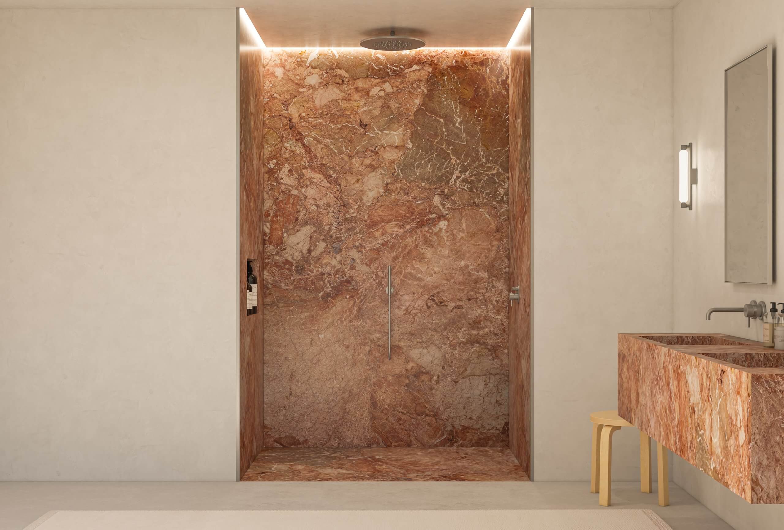 Breccia Pernice ist ein italienischer Marmor mit einer charakteristischen roten Farbe, bereichert durch rosa und goldene Adern, die ihm Dynamik und Bewegung verleihen. Er ist ideal für Innenanwendungen wie Verkleidungen, Böden und Küchen und verleiht einen Hauch von raffinierter Eleganz.