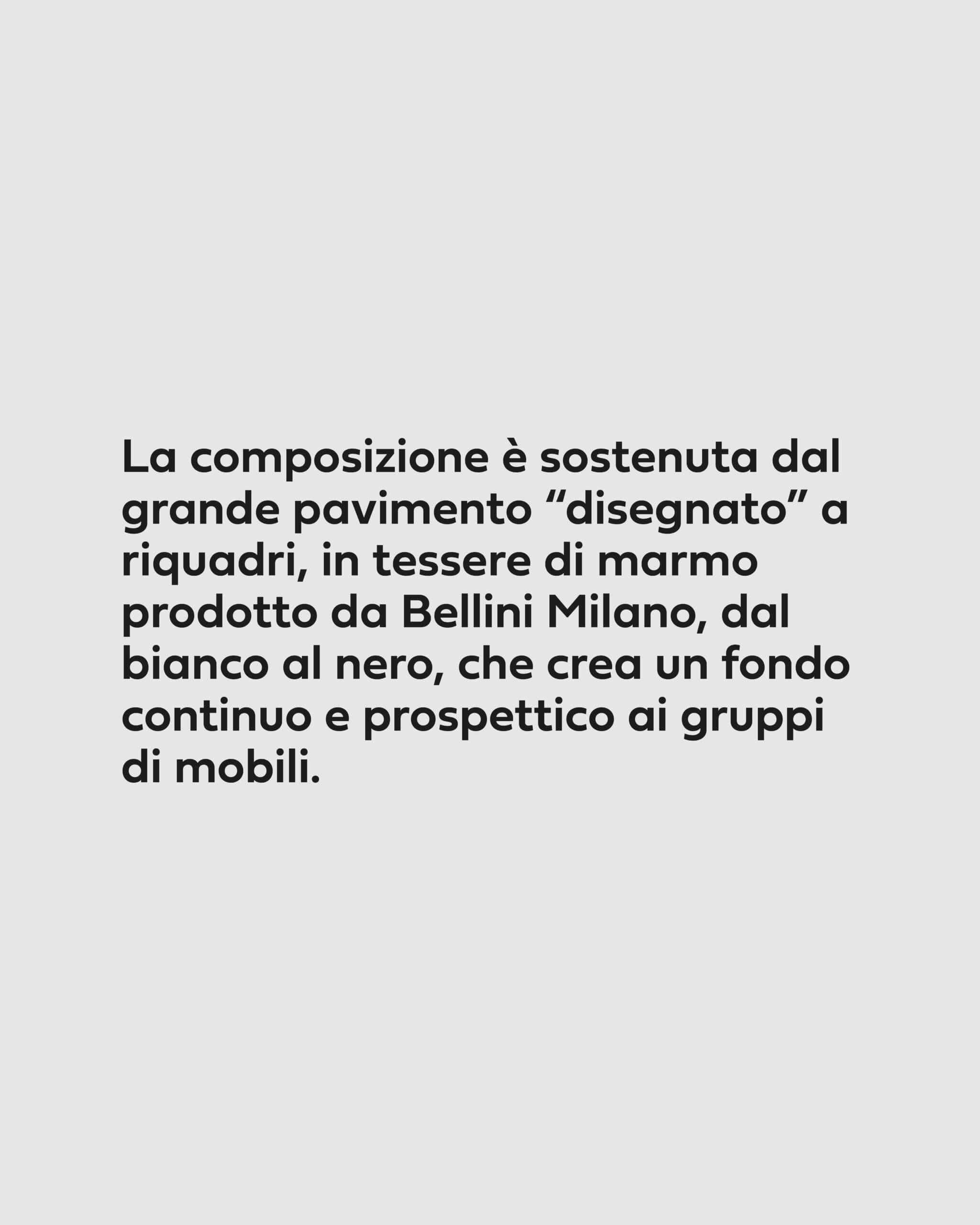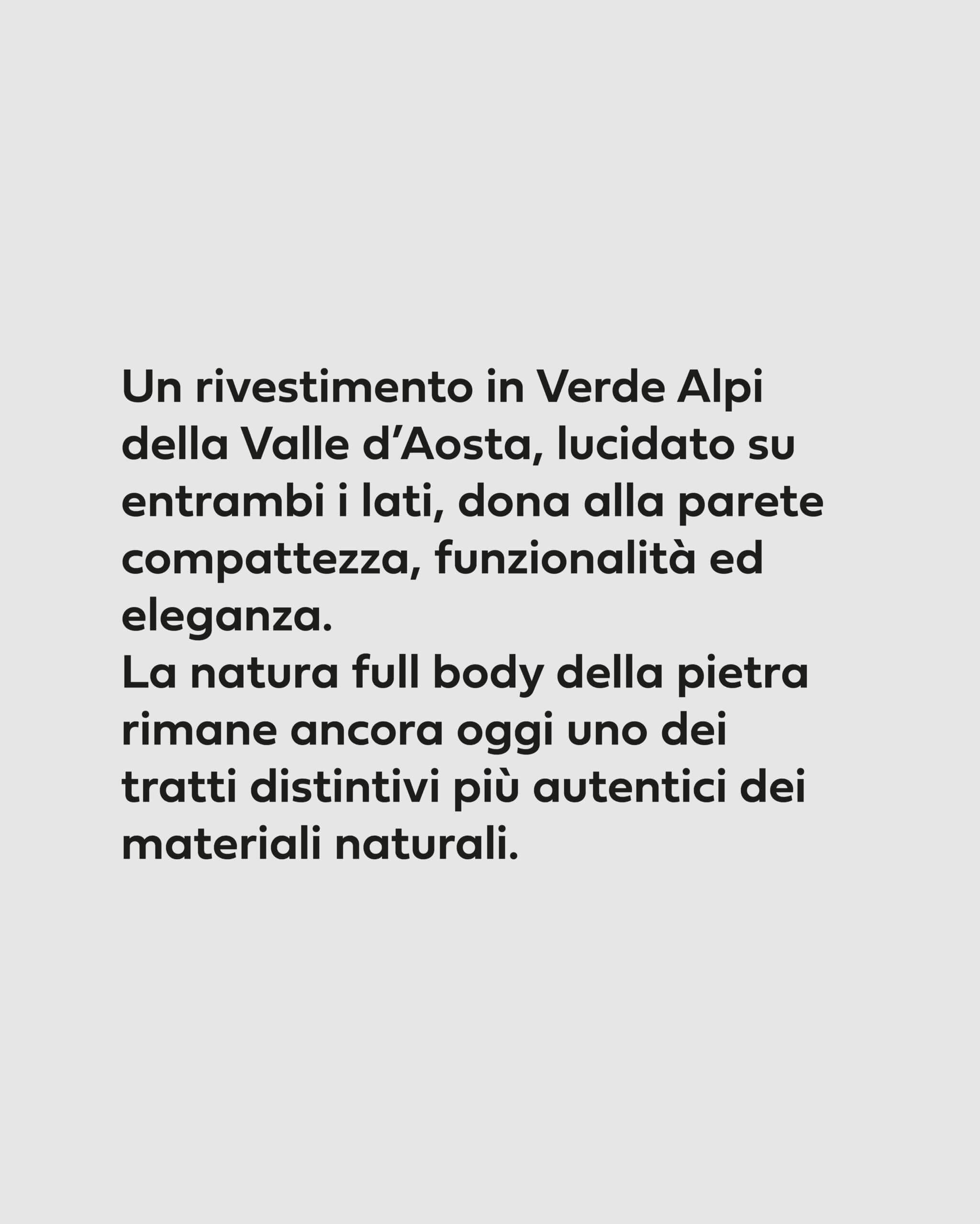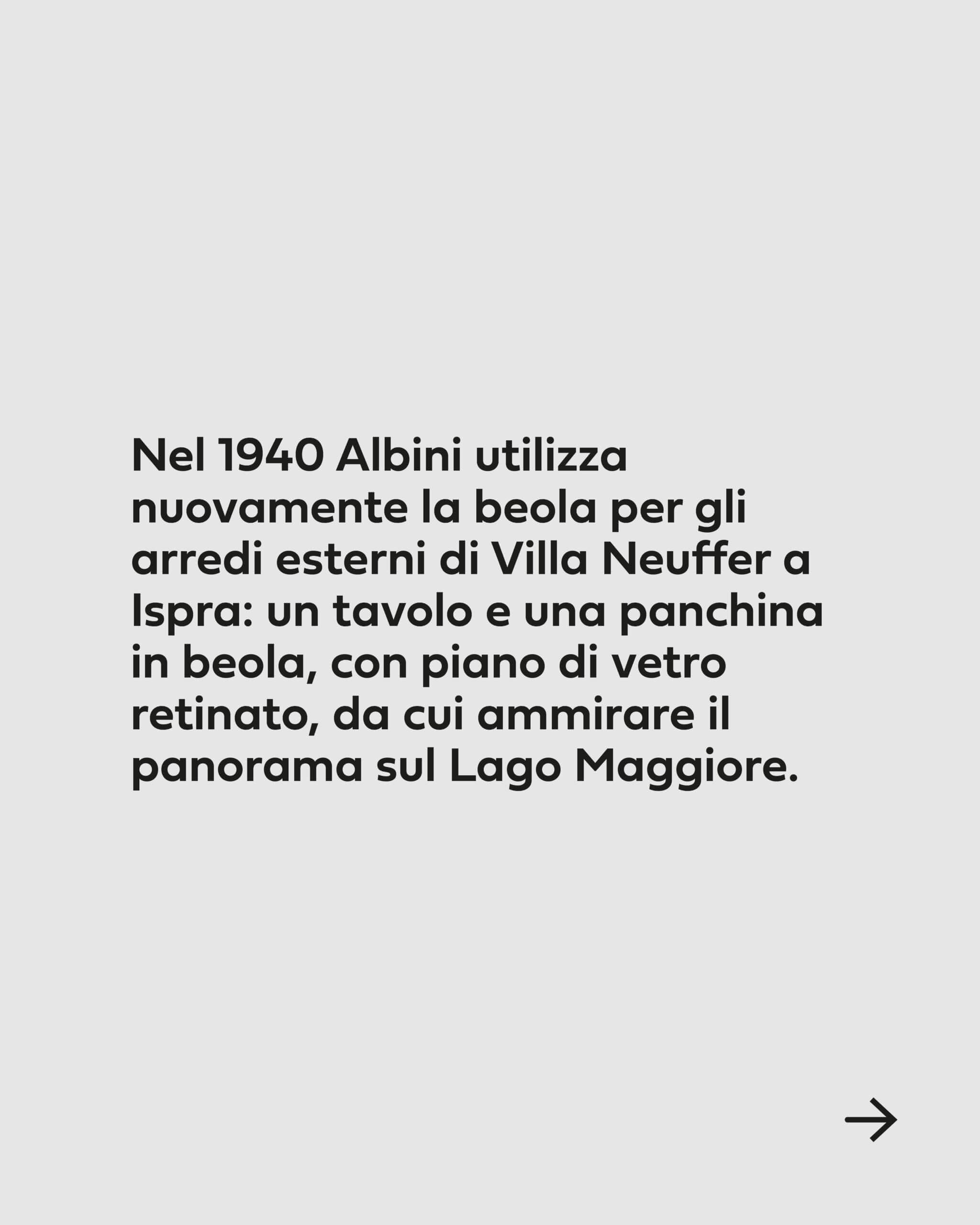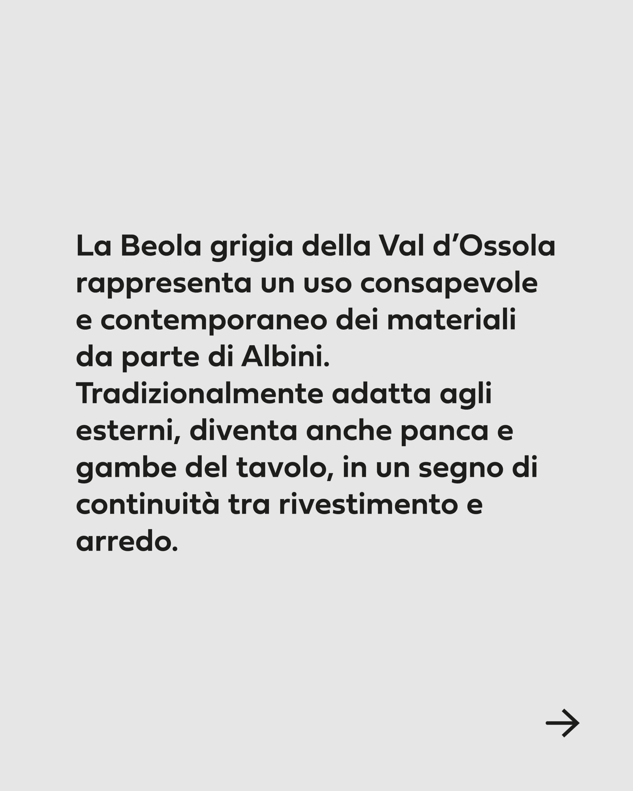 Nelle sue opere convivono materiali di grande modernità — acciaio, vetro, tubolare metallico — e materiali tradizionali come legno, giunco e pietra naturale, che assume un ruolo di continuità tra struttura e forma. In questa sintesi tra tecnica e sensibilità, Albini restituisce alla pietra la sua dimensione più autentica: strumento di verità, misura e permanenza.