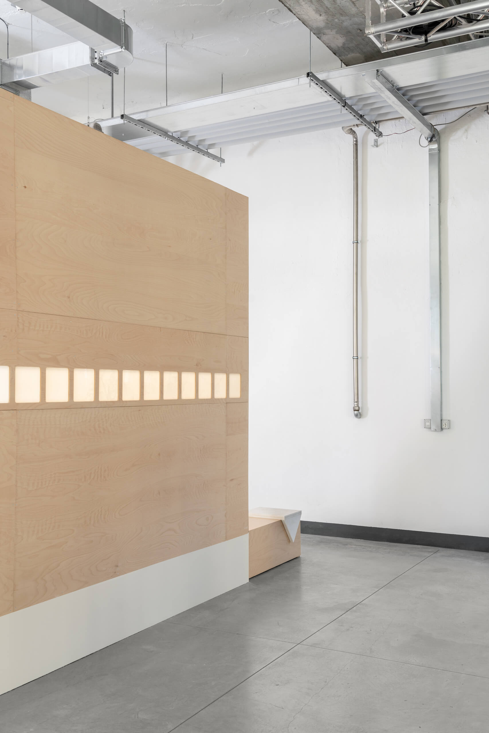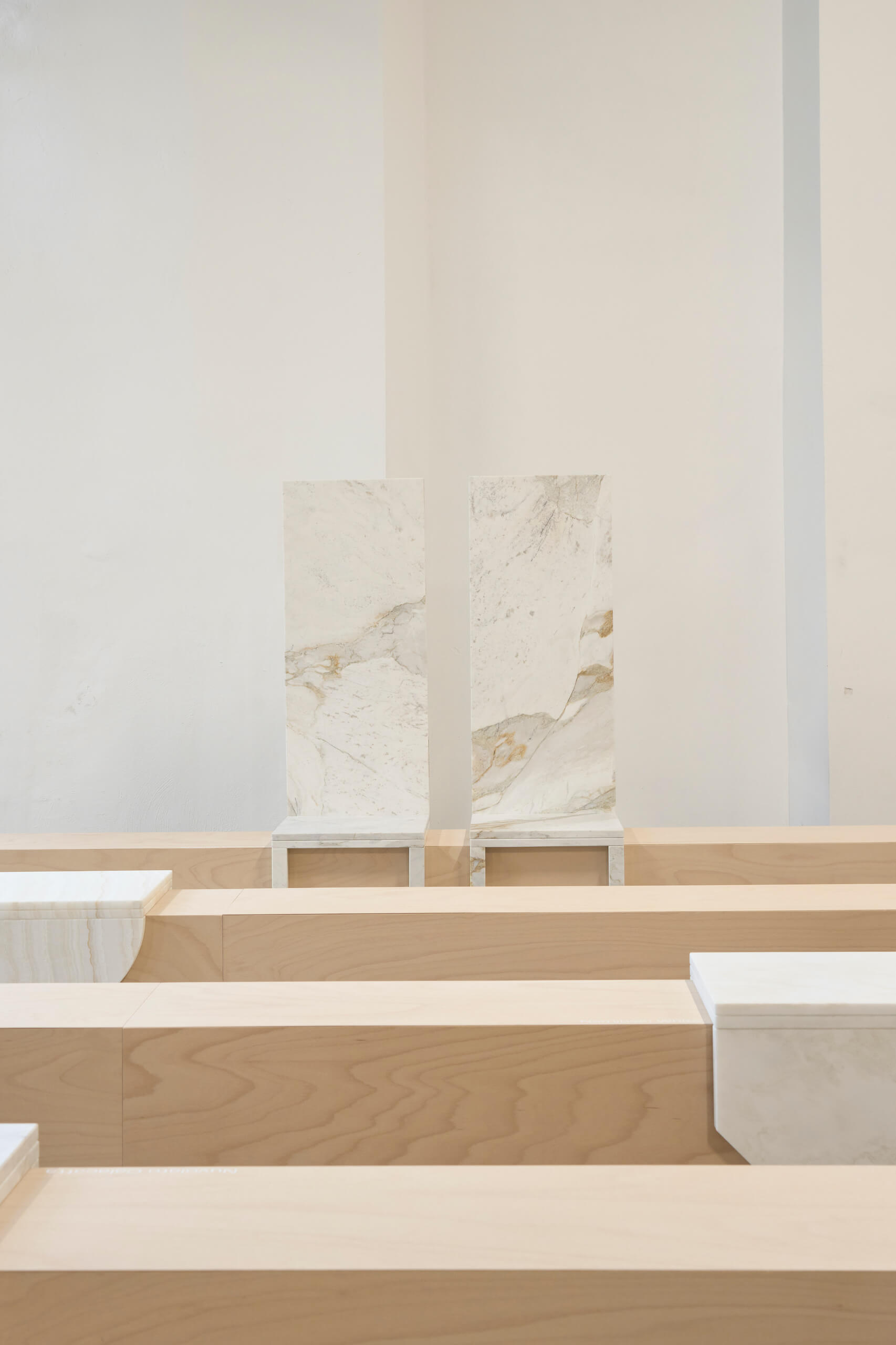 Lo spazio diventa area di sosta e riflessione, un’architettura gentile dove l’ironia si fonde con il progetto e dove la materia si fa ornamento.
