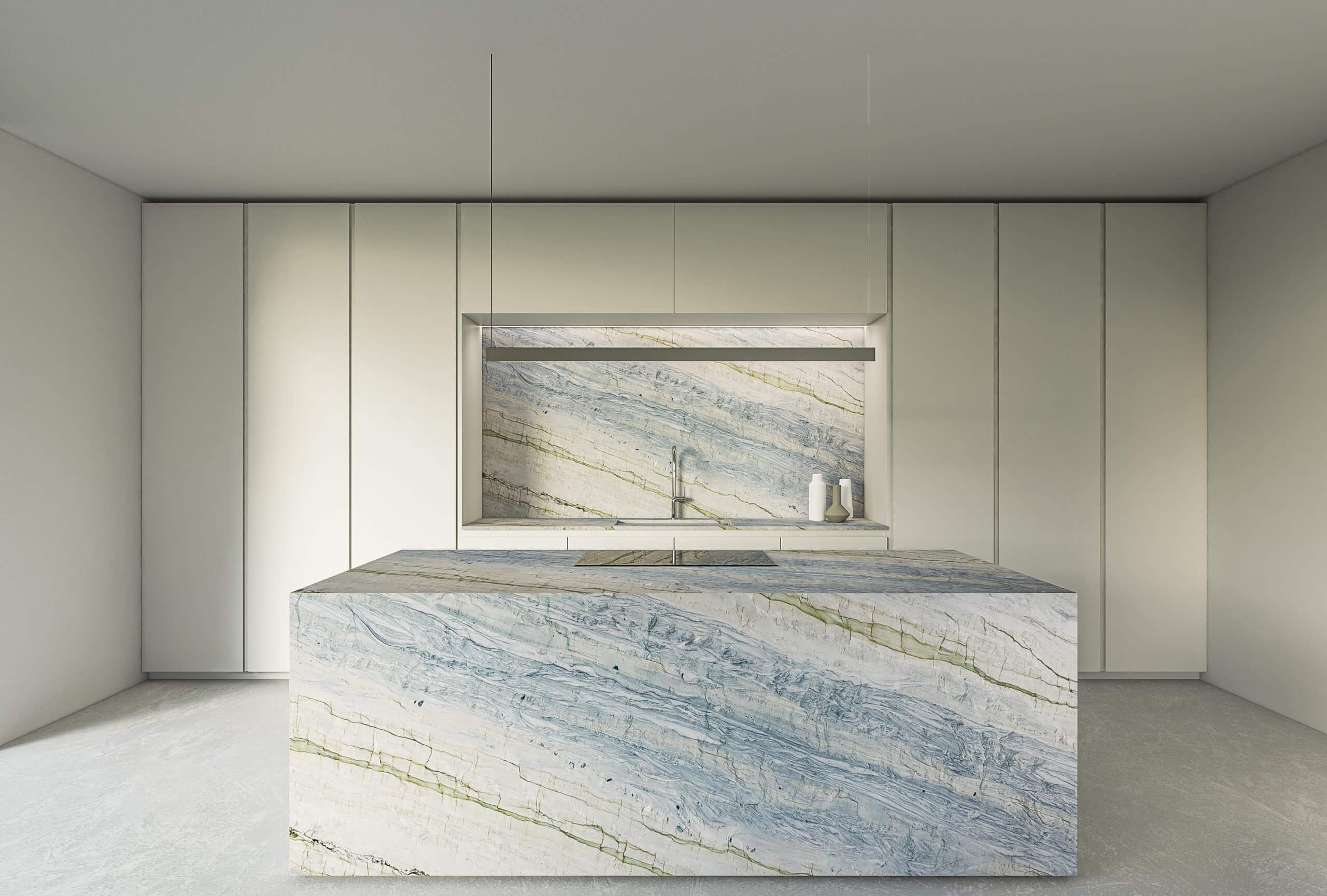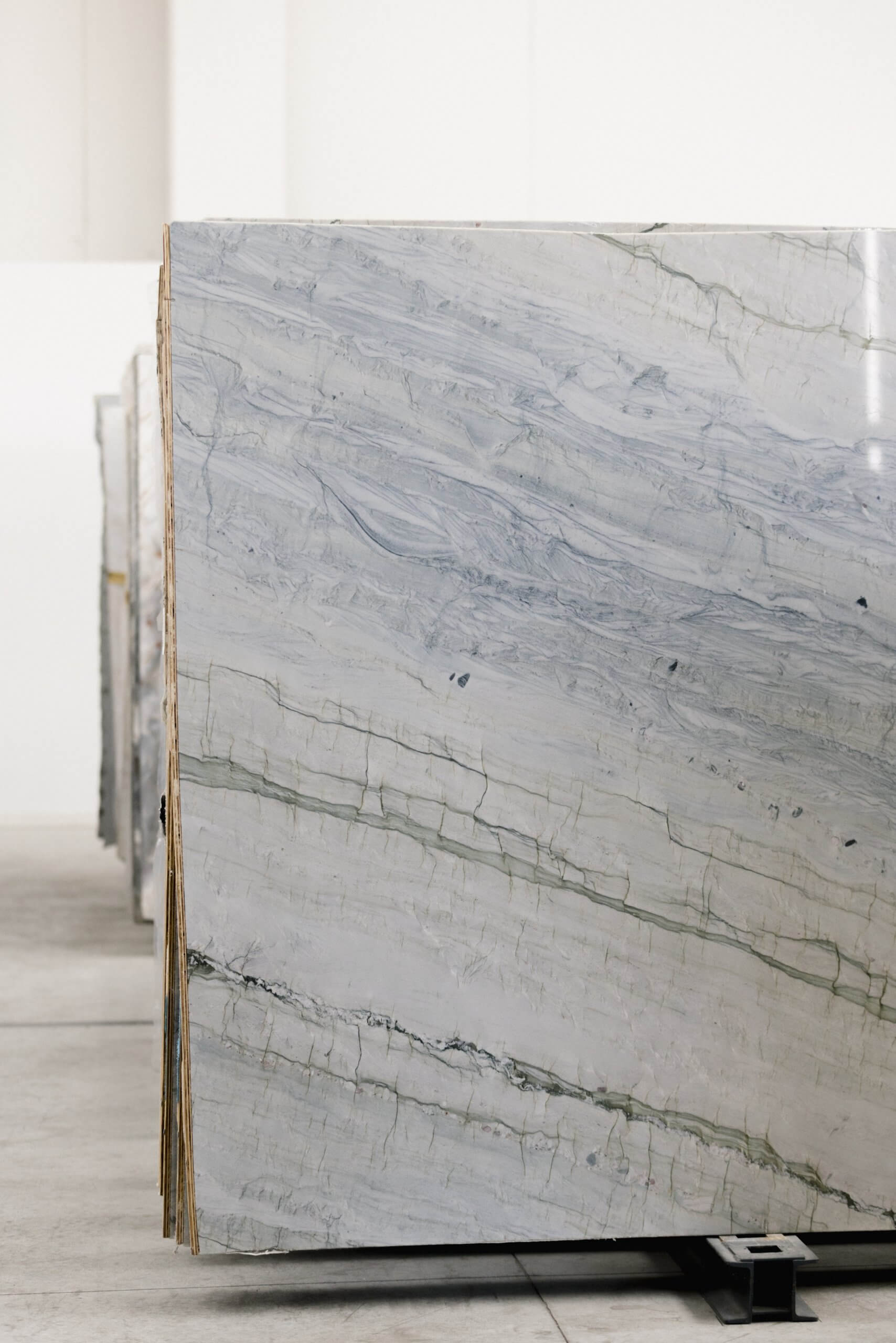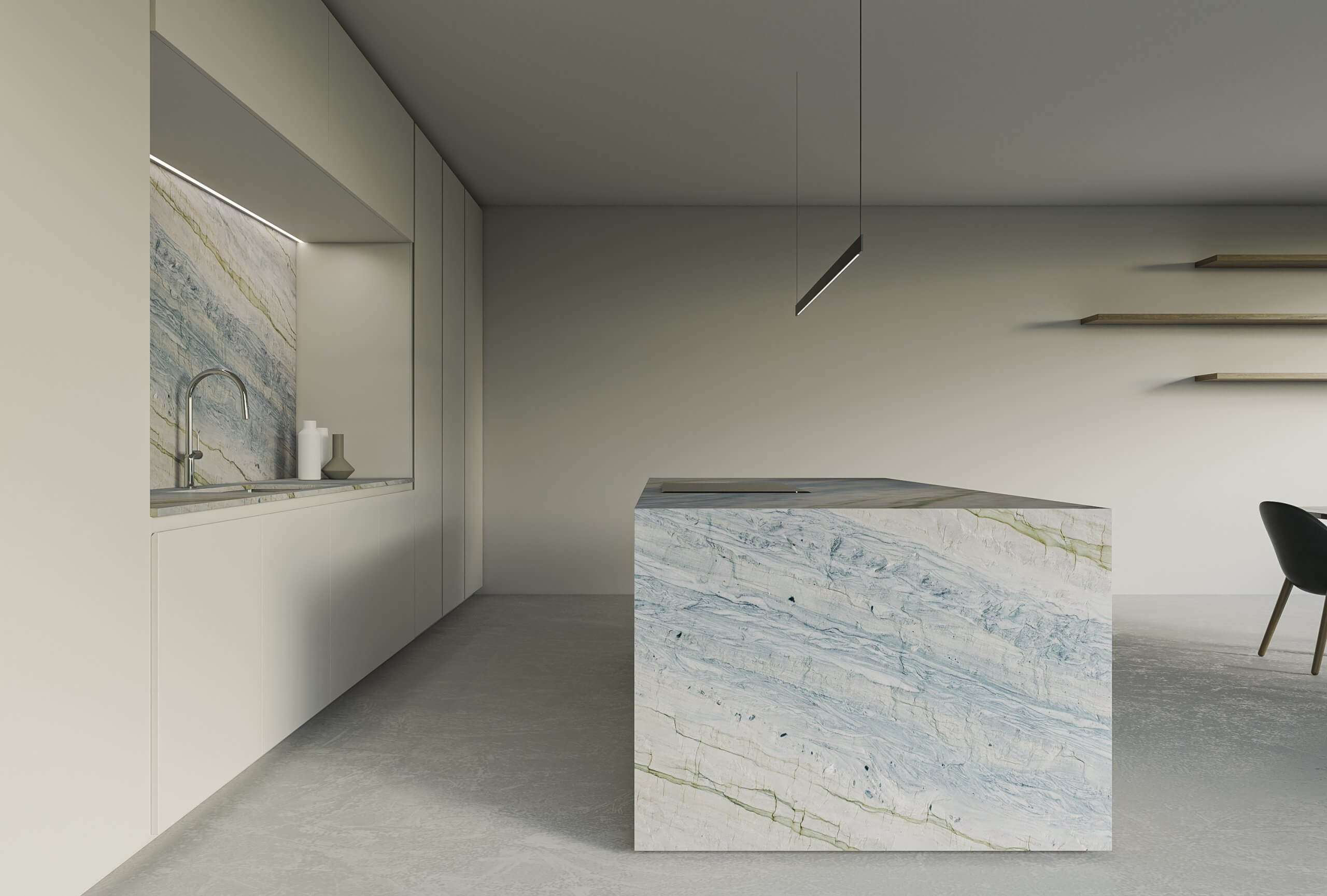 Ocean Blue is a Brazilian quartzite with blue-grey tones and fluid veining reminiscent of ocean floors. Elegant and durable, it’s ideal for cladding and kitchen countertops, combining natural beauty with high technical performance.